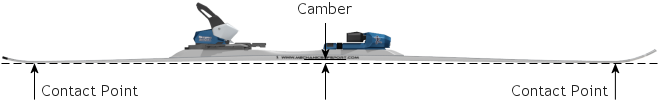 Camber is the shape a ski has vertically along its length. Most skis are arched so that the area under the binding is above the snow when there is no weight on the ski, with the areas at the ends of the sidecut touching the snow just before the tips start. This shape means that once weight is put on the ski, the flex of the ski will always try to push the whole length of the ski into the snow, which gives you more control from the edges. The amount of camber a ski has is measured by the height the middle of the ski sits above a flat surface when there is no weight put on it.