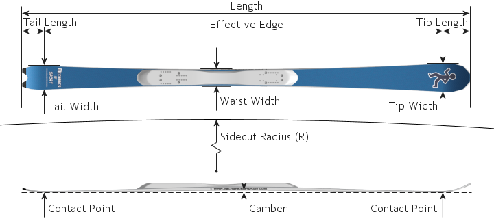 The edges are the metal strips that run down the sides of a ski. Edges are very important, and can make a big difference to the performance of a ski. There are many things that effect the edges and how they work, like sidecut radius, edge angle, sharpness and stiffness (stiffness is explained in it's own section). Lets look at the sidecut radius firstly.